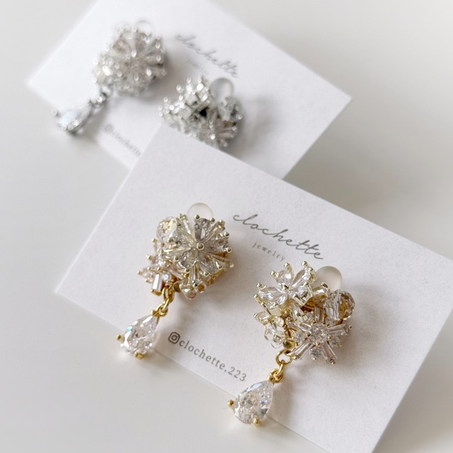 christmasだけの特別なデザイン " carol " clochetteからの一年に一度の贈り物 贅沢な輝きをどうぞお楽しみください 光の角度によって表情を変え 細やかで繊細な煌めきを放ちます 今年の carol は上品な「揺れ」を デザインに落とし込みました ダイヤモンドと同等の輝きといわれる ジルコニアパーツを贅沢に使用した 特別な日に相応しい気品 纏った瞬間、そっと背筋が伸び 誰かに見せたくなる 最高に美しい自分を楽しんでもらいたい そんな想いのこもった特別なデザインです カラーは ゴールド / シルバーよりお選びいただけます ┈┈┈┈┈┈┈┈┈┈┈┈┈┈┈┈┈┈┈┈┈ 良い状態で長くご愛用していただけるよう 下記セットをお付けさせていただきます ♢ アクセサリーポーチ(全5色) ♢ お手入れクロス ♢ 保管袋 ♢ ピアスキャッチ or イヤリングカバー 予備 ポーチのカラーは ランダムにてお届けさせていただきます ご希望がある場合は備考欄にご記入ください 【ブラウン / ベージュ / ネイビー / ピンク / ブルー】 ┈┈┈┈┈┈┈┈┈┈┈┈┈┈┈┈┈┈┈┈┈ 選択いただける金具について ③ ピアス チタン 金属アレルギー対応 サビや変色にも強く、アレルギーでない方にもおすすめです ① ピアス サージカルステンレス316L 金属アレルギー対応 医療用工具のメス機器に使われている素材です サビや変色にも強く、アレルギーでない方にもおすすめです 【 裏 樹脂仕上げ 】 ⑤ ピアス ロングポスト サージカルステンレス316L 15㎜のロングポスト 耳たぶが厚めの方におすすめです 金属アレルギー対応 医療用工具のメス機器に使われている素材です サビや変色にも強い 【 裏 樹脂仕上げ 】 ⑥ イヤリング ネジバネ式 耳に合わせてサイズを調節いただけます シリコンクッション付 ⑦ イヤリング クリップ式 広い面で支える為、負荷が分散され痛みが軽減されます シリコンクッション付 【 裏 樹脂仕上げ 】 ⑧イヤリング 調節クリップ式 耳に合わせてサイズを調節いただけます 広い面で支える為、負荷が分散され痛みが軽減されます シリコンクッション付 【 裏 樹脂仕上げ 】 ⑨イヤリング サージカルステンレス316L クリップ式 金属アレルギー対応 広い面で支える為、負荷が分散され痛みが軽減されます シリコンクッション付 【 裏 樹脂仕上げ 】 ┈┈┈┈┈┈┈┈┈┈┈┈┈┈┈┈┈┈┈┈┈ ラッピングについて ご購入いただいた全てのアクセサリーを 上記でご説明しましたポーチに入れて お届けさせていただいております お手渡しの際 ショップバックがご必要な場合は オプションよりご購入くださいませ (アクセサリー2点まで同梱可能) ┈┈┈┈┈┈┈┈┈┈┈┈┈┈┈┈┈┈┈┈┈ 発送について ご購入から10日後に発送させていただきます クリックポスト(追跡あり) お急ぎの場合は 商品欄トップにある「お急ぎ便対応」を ご一緒に購入くださいませ ┈┈┈┈┈┈┈┈┈┈┈┈┈┈┈┈┈┈┈┈┈ お直し対応させていただいております お気軽にご相談ください 初期不良の場合は新しいお品と交換いたします ┈┈┈┈┈┈┈┈┈┈┈┈┈┈┈┈┈┈┈┈┈
